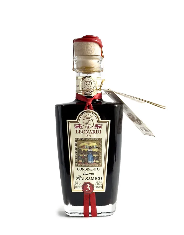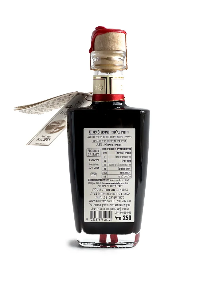 חומץ בלסמי משובח מאיזור מודנה באיטליה. מיושן בחביות עץ 3 שנים. טעמו מתקתק מעט ומרוכז. מתאים לסלטים, בשרים וכריכים