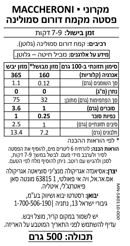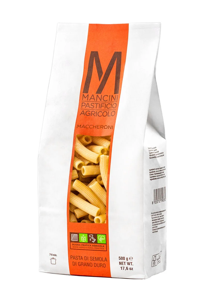 הפסטה מסוג מקרוני, הנה בפסטה קצרה, עבה וחלולה המיוצרת מחיטת דורום אשר גדלה בשדות שמסביב למפעל באיטליה. קמח דורום ומי מעיין הם המרכיבים היחידים בפסטה.